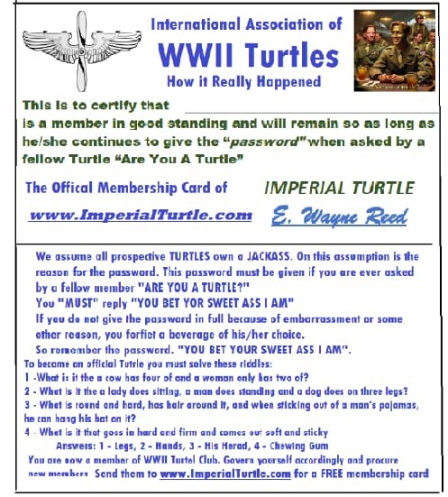 I. We assume all prospective Turtles own a Jackass. On this assumption is the reason for the Password. This password must be given if you are ever asked by a fellow member, “Are You A Turtle?”